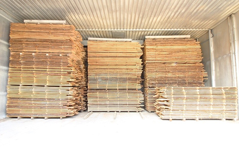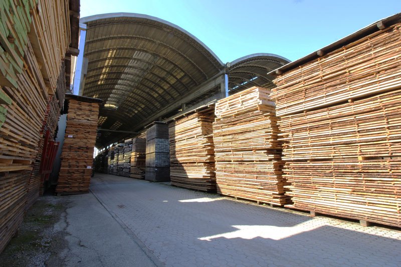 Le tavole sono essiccate in un forno a 50° per ridurre il contenuto di umidità. Con l'essiccazione una tavola larga 25 cm si ritira anche di 2 cm.